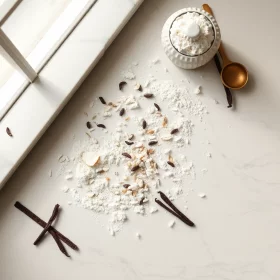 Marbré jaune et parfum gourmand. Une bougie régressive grâce à sa fragrance sucrée.